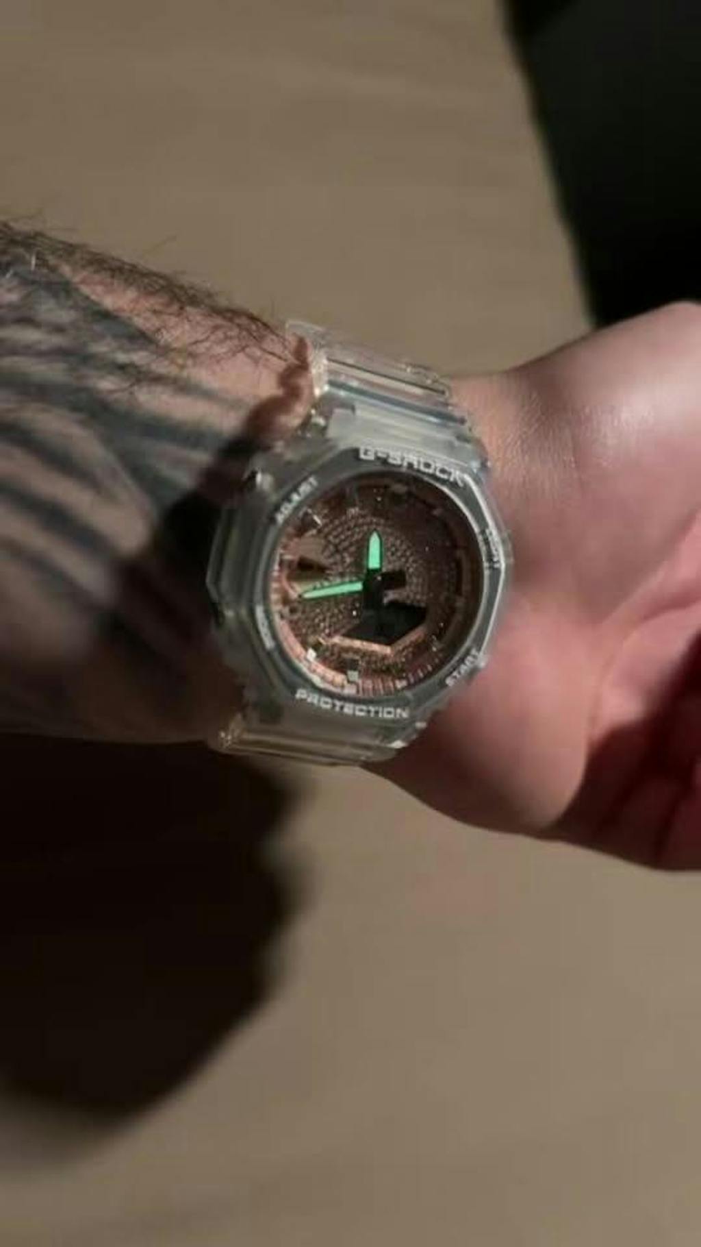 The clear case with a rose gold frosted dial. The transparent housing lets you see the watch from every angle while the rose gold dial catches and reflects light constantly. One of the most photographed pieces we make.